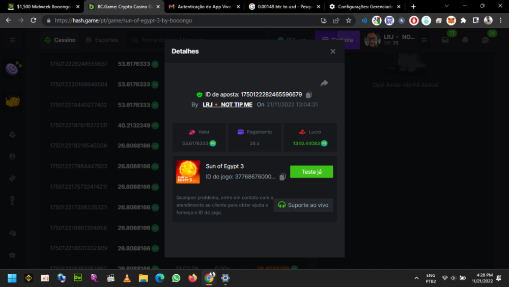 1. ID da aposta: 110315019522015268 https://bc.game/#/sd/111NNMGENML0CZ